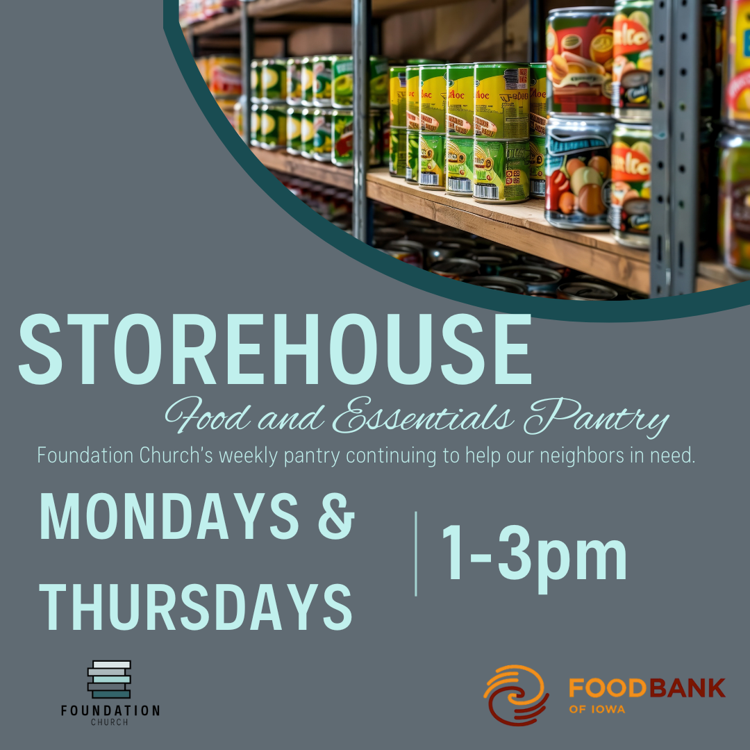 Born out of the great flood of 2024, our church continues to provide relief and provision to those in need, crisis, and disaster with Storehouse, an outreach partnered with our friends at the Food Bank of Iowa. We cooperate with community agencies and outreaches in our area in order to provide food and essentials for anyone, regardless of income.